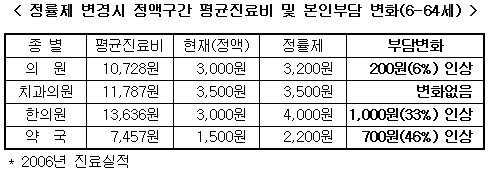 보건복지부의 본인부담 조정시 외래 본인부담 변화전망 자료를 보면 평균적으로 의원은 200원(3,000원→3,200원), 한의원은 1,000원(3,000원→4,000원), 약국은 700원(1,500원→2,200원) 본인부담이 늘어난다.