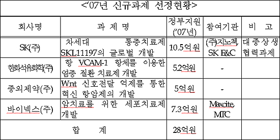 이번에 선정된 과제는 ▲SK의 차세대 통증 치료제 ▲한화석유화학의 항염증 치료제 ▲중외제약의 혁신형 항암제 ▲바이넥스의 항암 세포치료제 등이다.