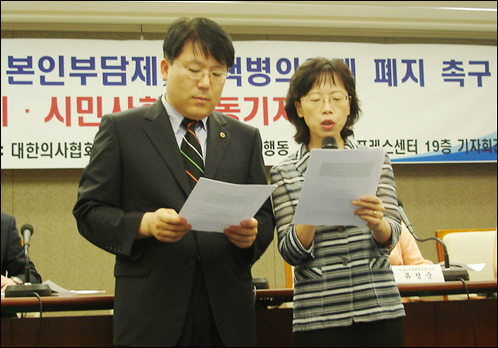 한편 이날 기자회견에는 의협에서 박경철 공보이사 겸 대변인, 장윤철 상근부회장, 건강세상네트워크 조경애 공동대표, 한국빈곤문제연구소 류정순 소장, 인권운동사랑방 활동가 최명숙씨, 인도주의실천의사협의회 이상윤 사무국장 등이 참석했다.