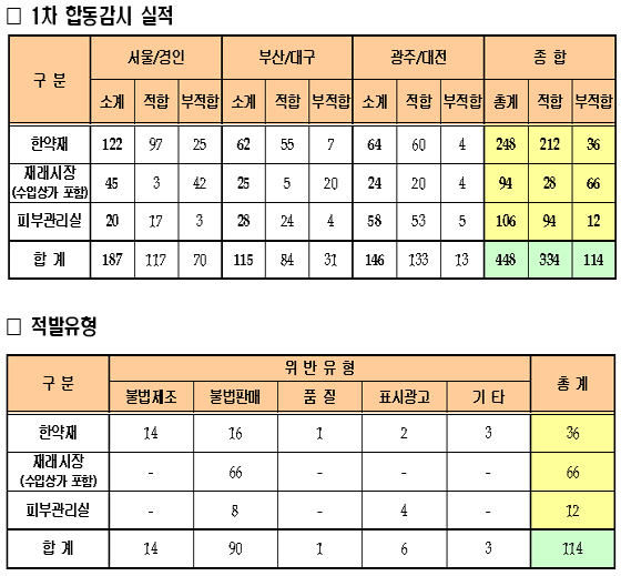 식약청(청장 김명현)은 지난달 18~22일 전국 주요 대형재래시장 수입상가와 한약재 시장, 피부관리실 등에서의 합동 단속 결과, 부정·불량약을 유통한 114개 업소를 적발했다고 9일 밝혔다.