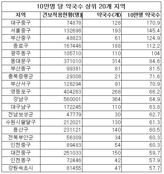 대구 중구와 서울 중구에 이어서는 부산 중구가 10만명당 124.9곳의 약국이 위치해 전국 3위를 기록했으며 서울 종로구 112.2곳, 광주 동구 104곳, 서울 동대문구 84.6곳, 부산 동구 81.5곳, 충북 증평군 71.6곳, 부산 서구 70.9곳, 서울 영등포구 66곳 등이 전국 10위권에 포함됐다.