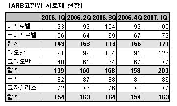 지난해까지 최고 매출을 올리던 아프로벨은 전분기 99억원에서 105억원으로 6% 성장하는데 그쳤으며 ARB계열 중 가장 오래된 약물인 코자는 81억원에서 86억원으로 역시 6% 성장해 3위로 밀려났다.