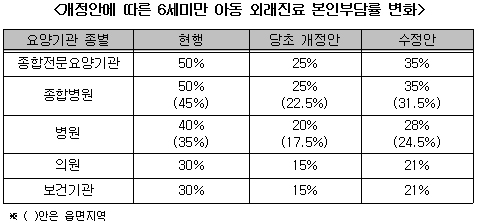 당초 개정안은 6세 미만 아동의 본인부담률을 성인 50%였다. 그러나 재개정안을 보면 성인의 70% 수준으로 변경됐다.