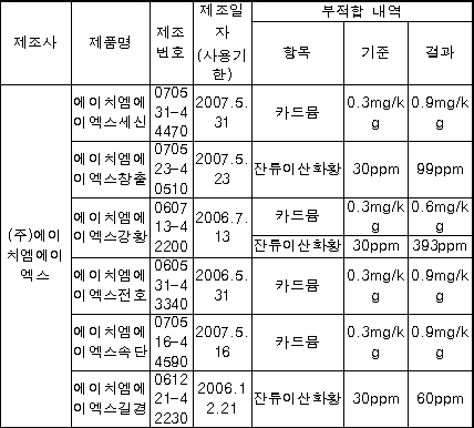 이번에 품질부적합 판정을 받은 품목은 (주)에이치엠에이엑스의 ▲에이치엠에이엑스세신 ▲에이치엠에이엑스창출 ▲에이치엠에이엑스강황 ▲에이치엠에이엑스전호 ▲에이치엠에이엑스속단 ▲에이치엠에이엑스길경 등이며, 이들 한약재에서는 카드뮴과 잔류이산화황 등이 검출됐다.