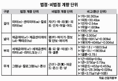 산업자원부가 7월 1일부터 법정계량단위 사용을 의무화하면서 평(坪), 인치, 갈론, 온스 등 비법정단위 도량형 사용시 50만원의 과태료를 물린다는 방침을 확정했기 때문.