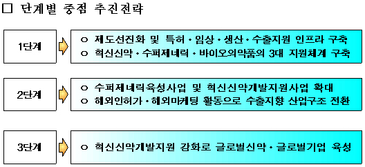 1단계(‘08~’10) 조치는 국내제도 선진화 및 제약산업 체질개선이 목표다. 2단계 사업(‘11~’12)은 개량신약을 기반으로 세계적 수준의 제네릭 기업을 육성하고 마지막 3단계(‘13~’17)는 글로벌 신약을 보유한 글로벌 기업 육성이다.
