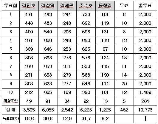 투표함별 득표수는 주수호 후보가 1,2 투표함에서 각각 733표와 692표, 김성덕 후보가 444표와 482표, 경만호 후보가 471표와 448표, 김세곤 후보가 245표와 248표, 윤창겸 후보가 101표와 119표를 획득했다.