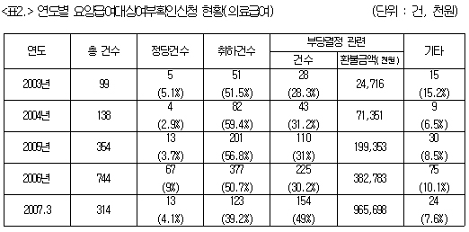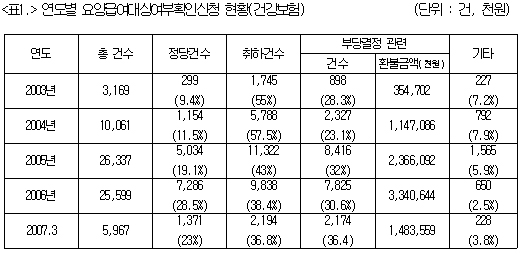 이같은 증가세는 올해도 마찬가지다. 2007년 3월 기준으로 14억8,555만원(2,174건)이 환자에게 부당징수 됐다.