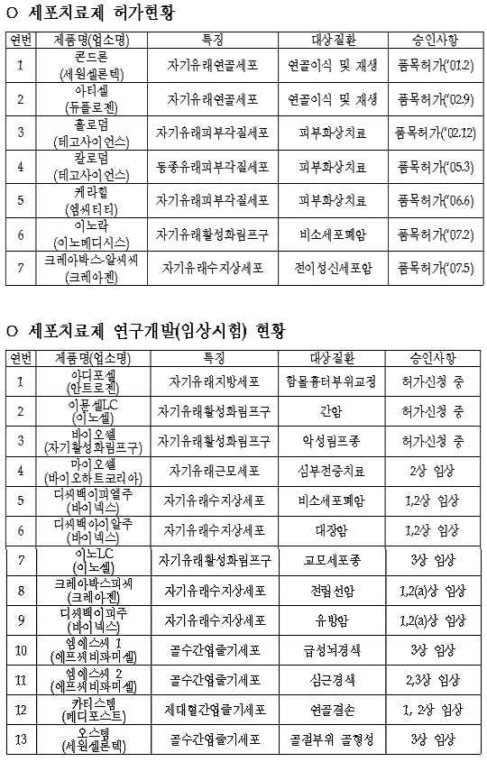 안트로젠의 '아디포셀'(함몰흉터부위교정)과 이노셀의 '이뮨셀LC'(간암) 등 3건은 허가신청 단계에 있으며 바이넥스의 '디씨백아이알주'(대장암) 등 10품목은 임상시험을 진행하고 있다.