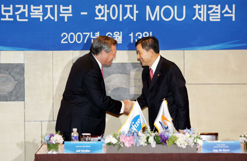 복지부는 변재진 복지부장관 내정자와 화이자 본사 제프 킨들러 회장이 이 같은 내용의 양해각서(MOU)를 13일 오전 서울 남산 하얏트호텔에서 체결했다고 밝혔다.
