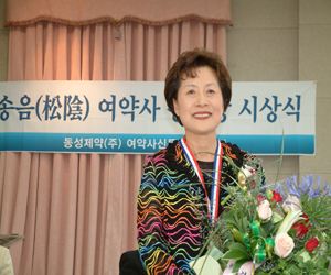 뿐만 아니라 장애인 무의탁노인 및 부랑아 시설지원 등 수많은 봉사와 물질적 지원을 아끼지 않고 있다고 수상자 선정이유를 밝혔다. 송음 여약사봉사상은 동성제약 창립 50주년을 맞아 보람된 일을 하고자 이 상을 제정하였으며 매월 한분씩 추천받아 봉사상을 수여하고 일년에 한번 수상자 가운데 한사람을 선정해 봉사대상을 수상할 계획이다
