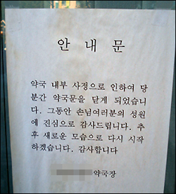 W약국은 '약국 내부 사정으로 당분간 약국문을 닫게 됐다'는 내용의 안내문을 문앞에 붙이고 석달째 영업을 하지 않고 있는 상황이다.