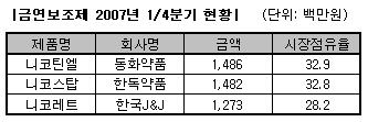 지난해 187억원 규모의 금연보조제 시장은 한독의 니코스탑이 110억원, 10월 출시된 동화의 니코틴엘이 15억원의 매출을 각각 기록해 제품간의 격차가 컸었지만 약국 영업력이 강점인 동화가 출시 6개월만에 전세를 역전시켰다.