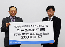 곽병주 교수는 "이번 스톡옵션이 아주 의대 교육 및 연구 발전에 쓰이길 희망한다"며 "앞으로도 뉴로테크와 아주대학교가 더욱 긴밀히 협력하는 관계로 발전해 대학에서 파생한 벤처기업이 어떻게 대학과 상생하는 가를 보여주는지 지켜봐 달라"고 말했다.
