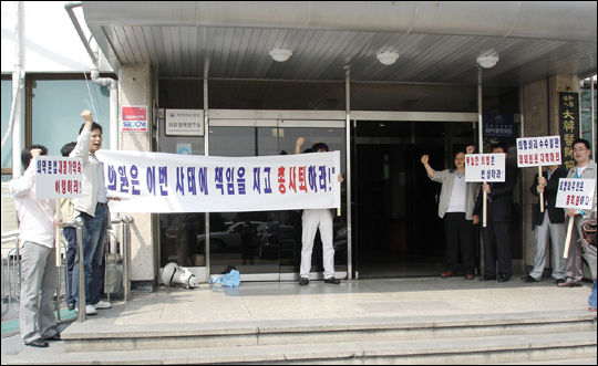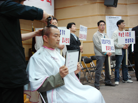 - 금품로비설 사태 책임...임총 전 회관앞서 피켓·삭발시위 벌여