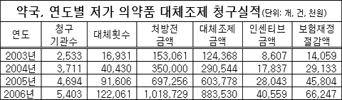 한편 원처방약을 저가약으로 대체할 경우 인센티브를 지급하는 생동성인정 보험의약품 수는 지난 2003년 905품목에서 2004년 2,433품목, 2005년 3,588품목, 2006년 3,832품목으로 급증했다.
