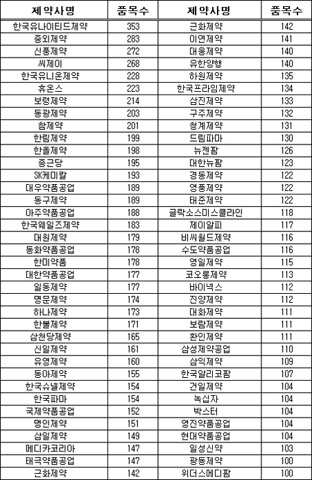 제약사별로는 유나이티드제약이 353품목으로 등재품목을 가장 많이 보유하고 있었고, 중외 283품목, 신풍 272품목, 씨제이 268품목, 한국유니온 228품목, 휴온스 223품목, 보령 214품목, 동광 214품목. 참제약 201품목 등의 순으로 뒤를 이었다.