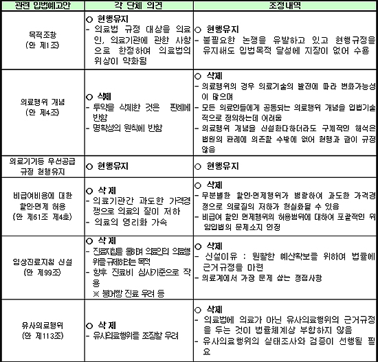 그러나, 입법예고기간(2월24일∼3월25일) 동안 의견이 개진됐지만, 의료인의 설명의무(안 제3조), 간호진단(안 제35조), 비급여항목 가격계약(안 제61조 제3호), 당직의료인 의무화(안 제63조), 비전속진료(안 제70조) 등은 수용되지 않았다.
