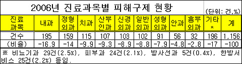 진료과목별로는 내과가 195건(16.9%)으로 가장 많았고, 정형외과 159건(13.8%), 치과 115건(9.9%), 산부인과 107건(9.3%), 신경외과 103건(8.9%), 일반외과 102건(8.8%), 성형외과 91건(7.9%) 등의로 뒤를 이었다.