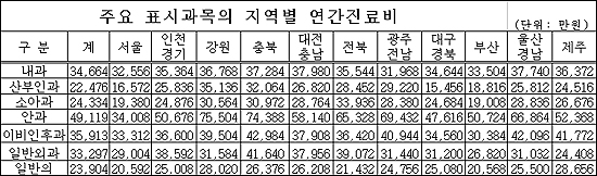 지역별로는 산부인과의 경우 강원은 3억5,136만원인데 반해 대구·경북은 1억5,456만원으로 기관당 수입이 무려 2.3배나 차이가 발생했다. 안과도 강원 7억5,504만원, 서울 3억4,008만원으로 2.2배의 높은 격차를 보였다.