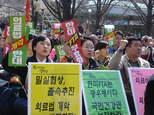 한편 의료연대회의 소속 단체 회원들은 이날 서울 대학로 마로니에공원에서 제59회 보건의날을 기념한 집회를 갖고 의료법 개악 중단과 한미 FTA 협상 전면 무효화를 정부에 촉구했다,