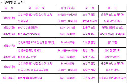 강의는 내달 2일부터 10일까지 새롭게 단장한 약사회관에 열리며 일반약, 건기식, 세무, 마약류 강좌 등이 소개될 예정이다.