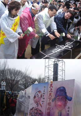 이날 행사의 하이라이트는 4개 단체 회원이 상여를 들고 '국민건강 장례식'을 치른 장면. 연이어 유시민 장관의 캐리커쳐가 그려진 나무판에 물감이 든 물풍선을 던지는 퍼포먼스까지 선보였다. 또 식전행사에서는 이범용 씨를 비롯해 의사, 한의사, 치과의사 출신 가수들이 사노라면, 노을, 사람이 꽃보다 아름다워 등 집회 열기를 위해 작은 공연도 마련했다.