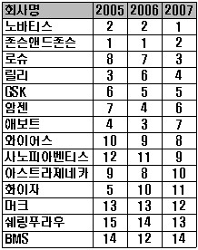 존슨앤드존슨은 2위로 노바티스의 뒤를 이었고 로슈가 7위에서 3위, 릴리가 6위에서 4위, 와이어스가 9위에서 8위, 사노피아벤티스가 11위에서 9위로 각각 1년만에 순위가 상승했다.