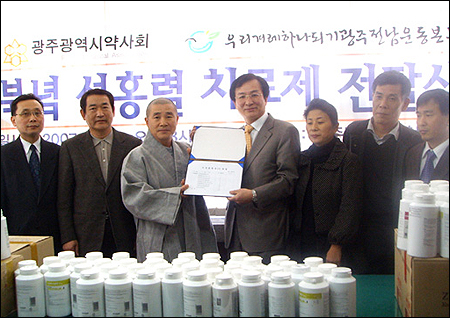 광주시약은 지난 13일 우리겨레하나되기운동 광주본부를 방문해 북한동포 1만4,000여명 분의 전염병 치료제를 전달했다.