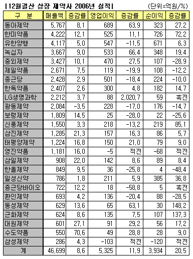 데일리팜이 12월결산 25곳의 2006년 매출현황을 집계한 결과, 평균 8.6%의 매출 성장률을 나타낸 것으로 조사됐다.