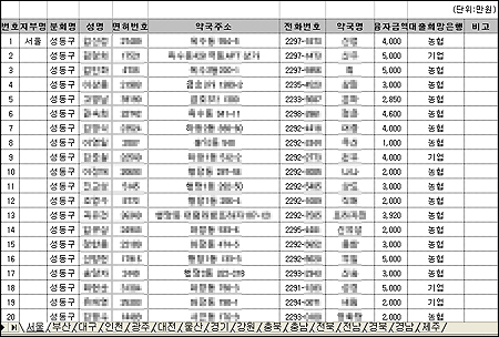 이 자료에는 시도약사회, 분회별로 일목요연하게 융자를 신청한 약사 이름, 면허번호, 약국이름, 주소, 전화번호, 대출은행, 대출금액까지 모든 정보가 망라돼 있다.