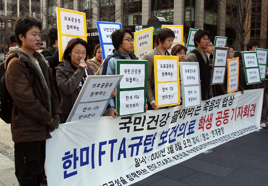 전국약학대학생협의회(전약협)와 전국한의과대학학생연합(전한련)으로 구성된 ‘의료 공공성을 침해하는 한미FTA 저지 보건의료학생모임’은 이날 오전 서울 광화문 청계광장에서 기자회견을 갖고 “국민의 건강권을 미국 제약사의 손에 쥐어줄 수 없다”고 주장했다.
