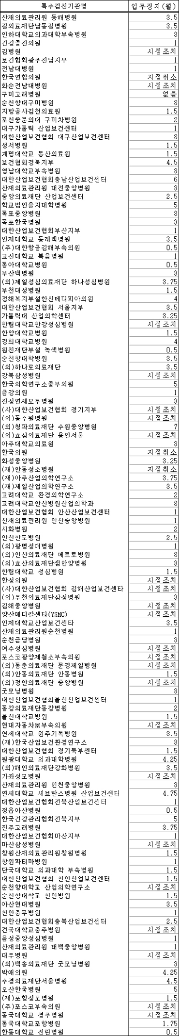 한편 특수건강진단기관은 DMF, 톨루엔, TEC 등 177개 유해물질에 노출된 근로자의 건강진단을 할 수 있도록 노동부가 지정한 의료기관으로, 대학병원 36곳, 보건협회 15곳, 산재병원 7곳, 기타 병·의원 62곳을 포함해 총 120곳이 지정을 받았다.