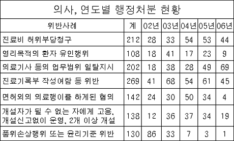 또 ‘개설자가 될 수 없는 자에게 고용, 개설신고 없이 운영, 2개소 이상 개설’ 138건, ‘품위손상해위 또는 윤리기준 위반’ 130건, ‘영리목적의 환자 유인행위’ 108건 등으로 나타났다.