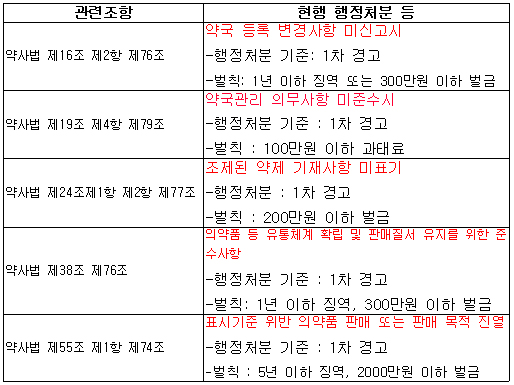 1차 경고를 받는 사항은 ▲약국 등록 변경사항 미신고 ▲전문약과 일반약의 구분 진열 등 약국 관리의무 위반 ▲조제된 약제의 표시 의무위반 등이다.