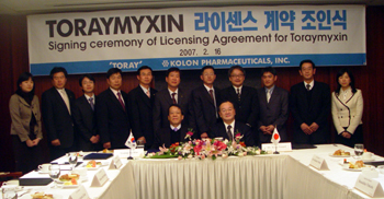 코오롱은 16일 도레이와 중증 패혈증 환자를 겨냥한 혈액투석필터 도레이믹신의 국내도입 조인식을 가졌다.