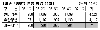 12월 결산법인(2006.1.1~12.31)인 한미와 유한이 각각 4,000억원을 첫 돌파하며 회기를 마친 가운데 업계의 관심은 3월결산인 대웅의 마지막 분기실적에 쏠려있다.