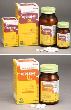 미야리산U정은 주원료인 미야이리균 외에 UDCA(우르소데스옥시콜린산)를 함유하고 있어 정장, 변비, 묽은 변 등 장에 대한 효과는 물론, 소화불량, 식욕감퇴, 식욕부진, 과식, 식체, 위체, 소화촉진, 소화불량으로 인한 위부팽만감 등 위에 대한 효능효과가 추가됐다.