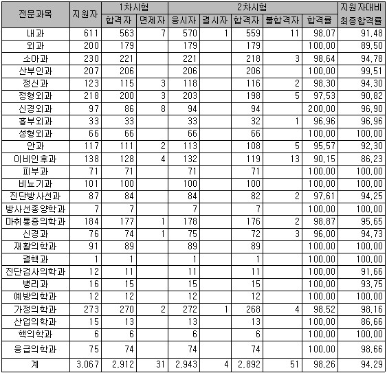 이번 시험 결과 피부과, 성형외과, 방사선종양학과, 결핵과, 예방의학과, 핵의학과 등 6개 과목은 응시자 전원이 합격해 100% 합격률을 기록했다.