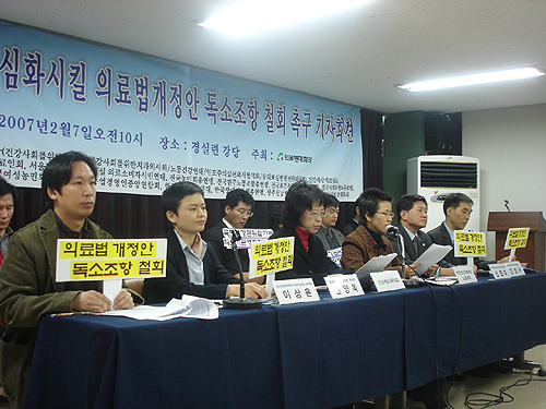 경실련 등 20여개 시민사회단체로 구성된 '의료의 공공성과 건강보험 보장성 강화를 위한 연대회의'(이하 의료연대회의)는 7일 오전 경실련 강당에서 기자회견을 갖고 "의료법 전면개정 졸속추진을 중단하고 국민건강권보장과 의료공공성을 강화하는 방향으로 의료법을 개정하라"면서 이 같이 촉구했다.