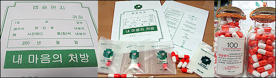 일반 약국에서 사용되는 약봉투와 똑같은 모양의 이 편지지는 ‘내 마음의 처방’이라는 약국명에 ‘매식사 전·간·후 내생각’, ‘매 O시간마다 O정씩 내생각’ 같은 다소 낯간지러운 사랑의 문구들을 담고 있다.