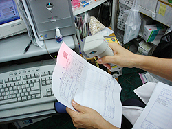 이 약국에서는 환자가 처방전을 가지고 오면 처방전에 인쇄된 바코드에 스캐너를 비추기만 하면 처방입력이 자동으로 이뤄진다.