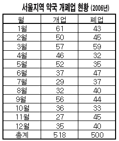 한편 서울 24개 지역에서 지난해 개업한 약국은 총 518곳이었고 폐업약국은 500곳이었다. 실질 증가는 18곳이었다.