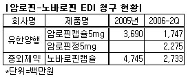 2005년 EDI 청구액이 36억9,000여만원이었던 암로핀캡슐5mg은 정제가 본격 판매된 2006년에 접어들면서 매출 역전현상이 나타났다. 작년 상반기 청구액은 캡슐 17억4,700여만원, 정제 22억7,500여만원이었다.