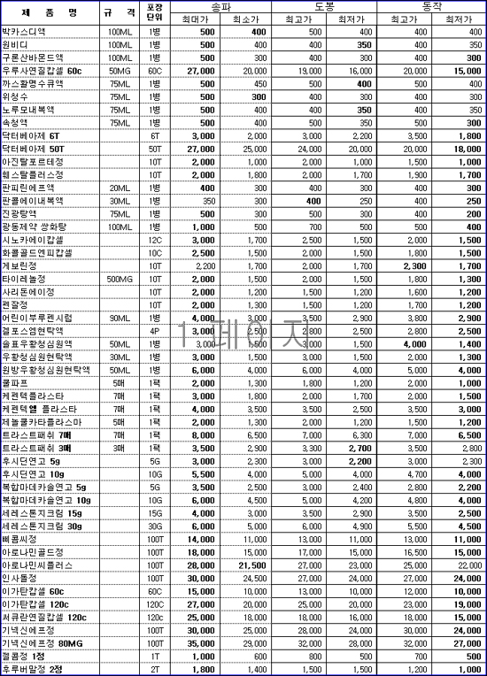 이와 함께 조선무약 ‘솔표우황청심원액’(50ml) 1,400원~4,000원, 광동 ‘우황청심원현탁액’(30ml) 1,300원~3,000원 등 우황청심원도 최저가와 최고가간 가격 차가 두 배가 넘었다.