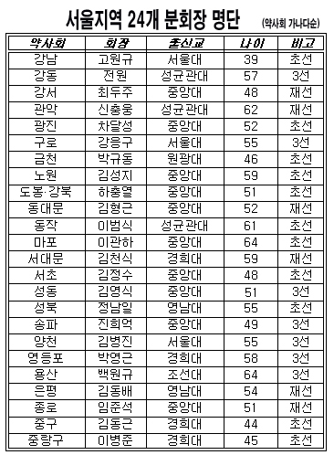 24개 분회장의 면면을 보면 중앙대 약대 출신이 10명으로 가장 많았고 50대 회장이 13명 나왔다. 초선 회장은 11명이었다.