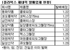현재 플라빅스 제네릭을 발매한 국내업체는 총 4곳. 작년 9월 세레나데정을 출시한 참제약을 필두로 진양제약(크리빅스정), 동아제약(플라비톨정), 건일제약(건일클로피도그렐정)이 제네릭 시장에 뛰어들었다.