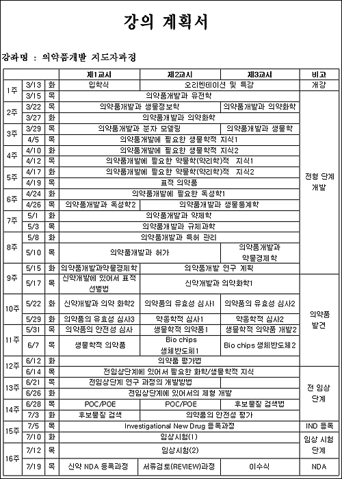 강좌 계획서를 보면, 의약품 전형단계 개발에서부터 발견, 전 임상단계, IND등록, 임상시험 단계, NDA 등록과정 등 의약품 개발 전반의 짜임새 있는 주제들로 구성돼 있다.