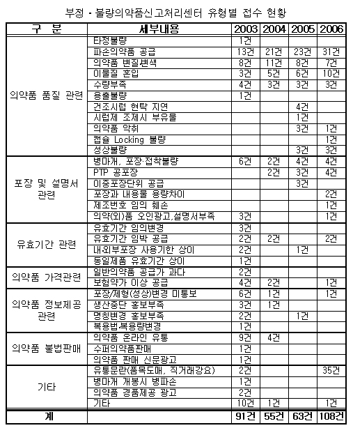 약사회 집계에 따르면 파손과 이물질 혼입이 각각 31건과 10건으로 조사돼 2005년도에 비해 증가세를 보였다. 변질변색은 줄었지만 7건이나 신고가 접수돼 여전한 것으로 나타났다.