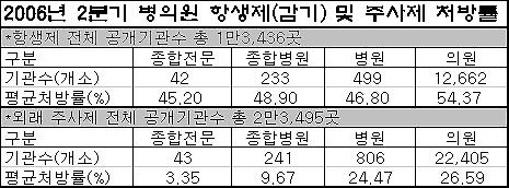 종별 처방률은 의원 54.37%, 병원 46.8%, 종합병원 48.9%, 종합전문병원 45.2% 등의 순으로 뒤를 이었다. 의원의 경우 항생제 적정성 평가가 시작 첫 해인 지난 2002년 2분기와 비교하면 12.5%p 가량 처방률이 하락했다.